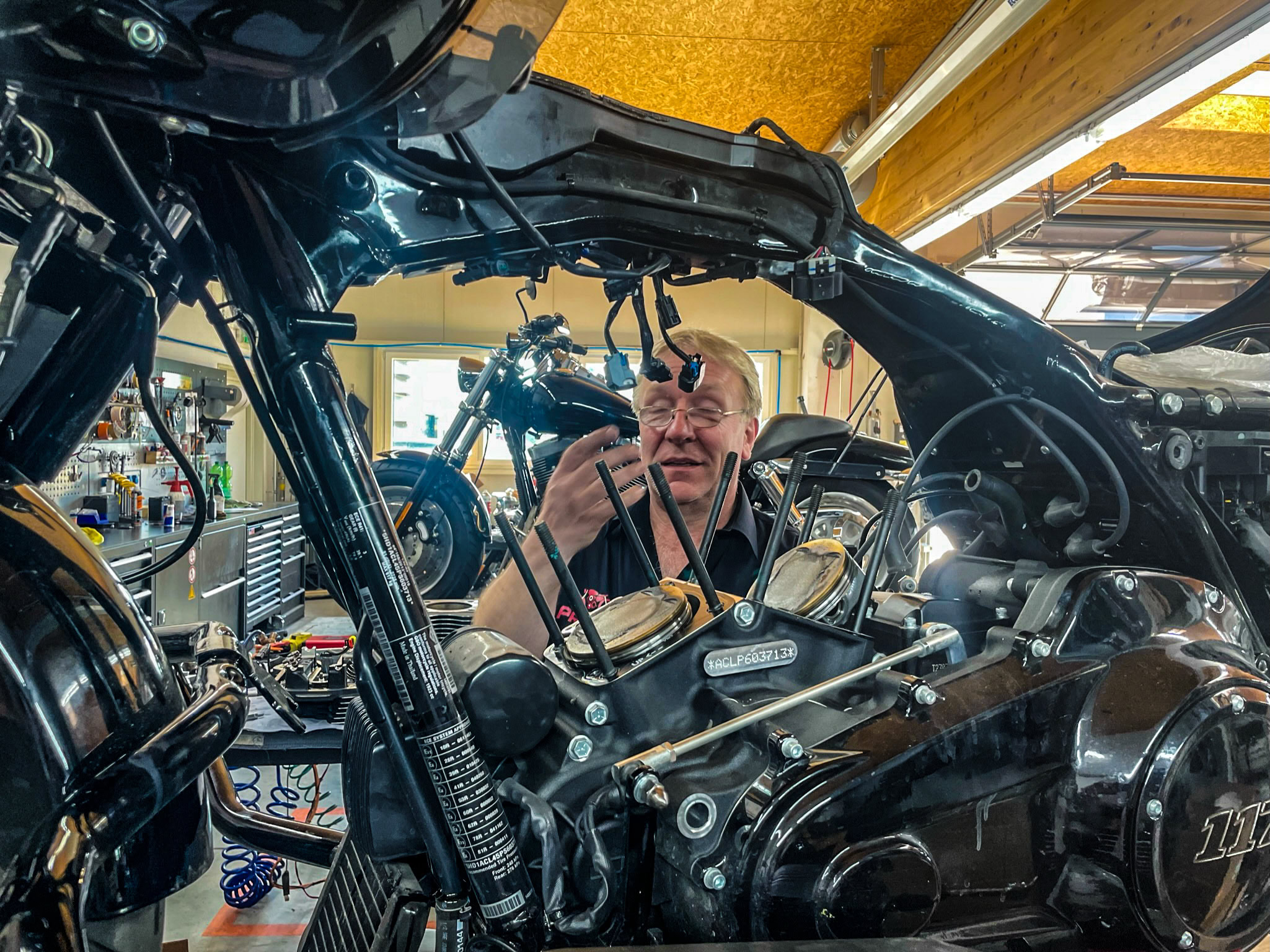Aber nun von Anfang an: Serienmäßig mit dem 117cui M8-Motor ausgestattet ist die Road Glide schon nicht schlecht motorisiert, es ist aber auch eine verdammt gute Basis für MEHR und nach dem Motto: „a bissl was geht immer noch“ konnten wir es auch hier nicht lassen dem Motor zu ein paar zusätzlichen Pferdchen zu verhelfen. Kurzerhand wurde ein Screamin´Eagle Stage IV 131er Kit bestellt. Dieser Kit besteht aus 131cui Zylindern mit hochverdichtenden Kolben, bearbeiteten Zylinderköpfen mit größeren Ventilquerschnitten, einer SE8-517 High-Lift Nockenwelle, 64mm Drosselklappenkörper, größeren Einspritzdüsen und noch vielem mehr.