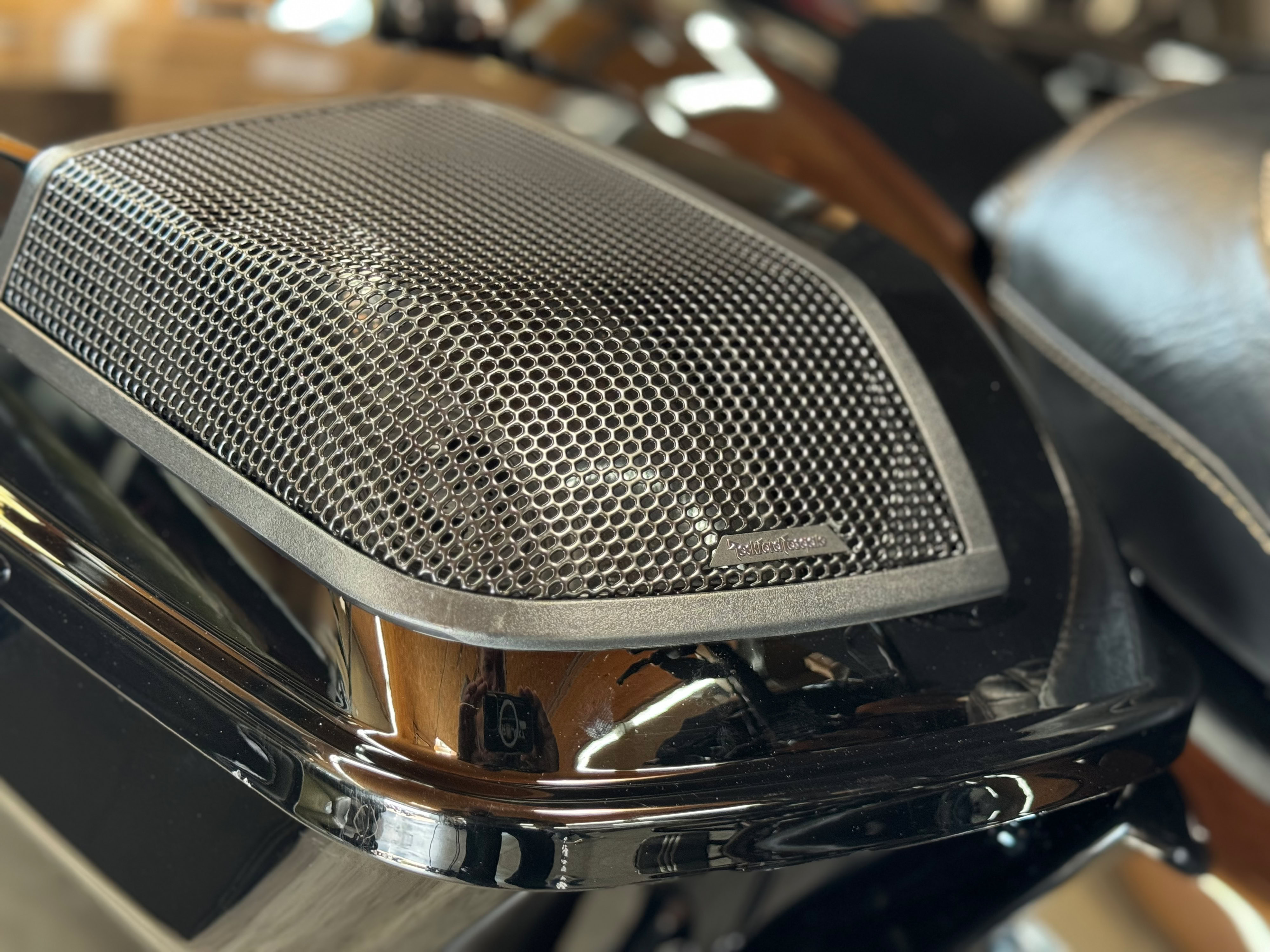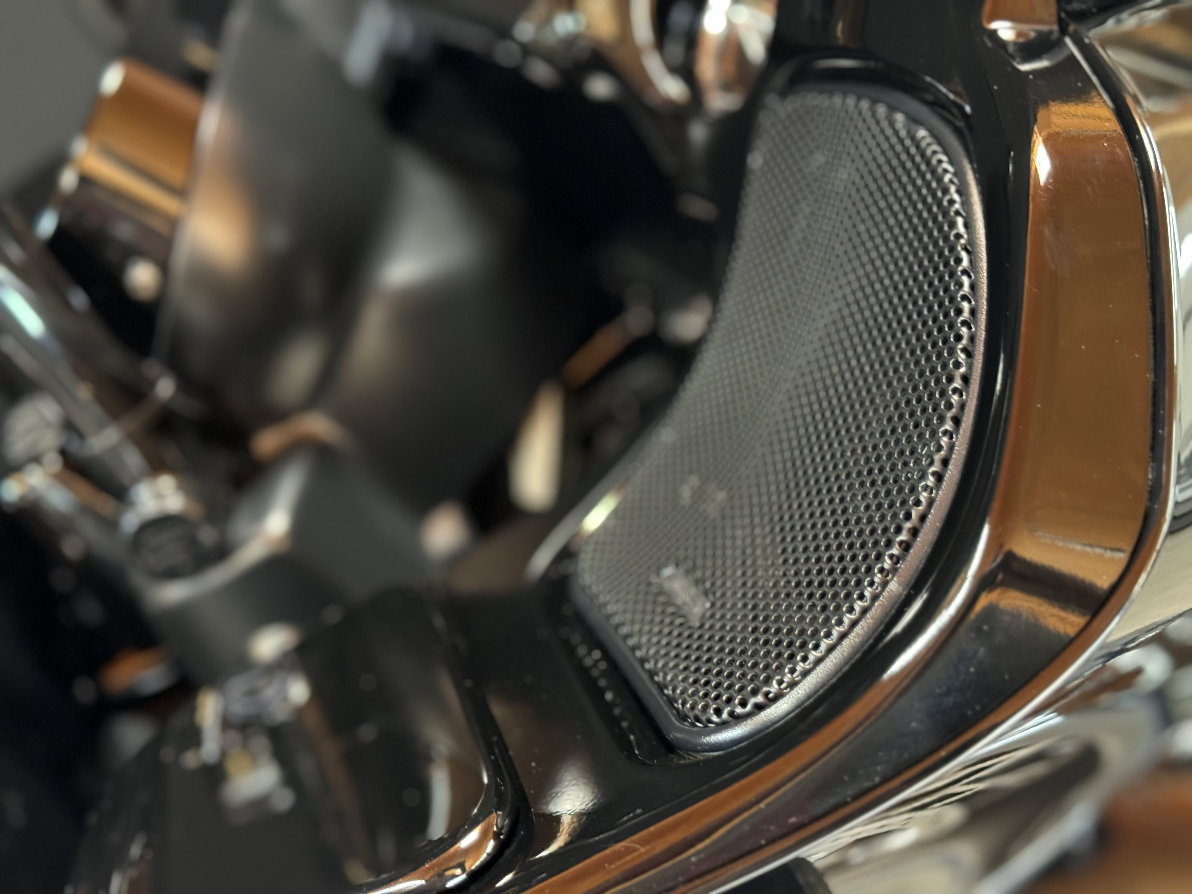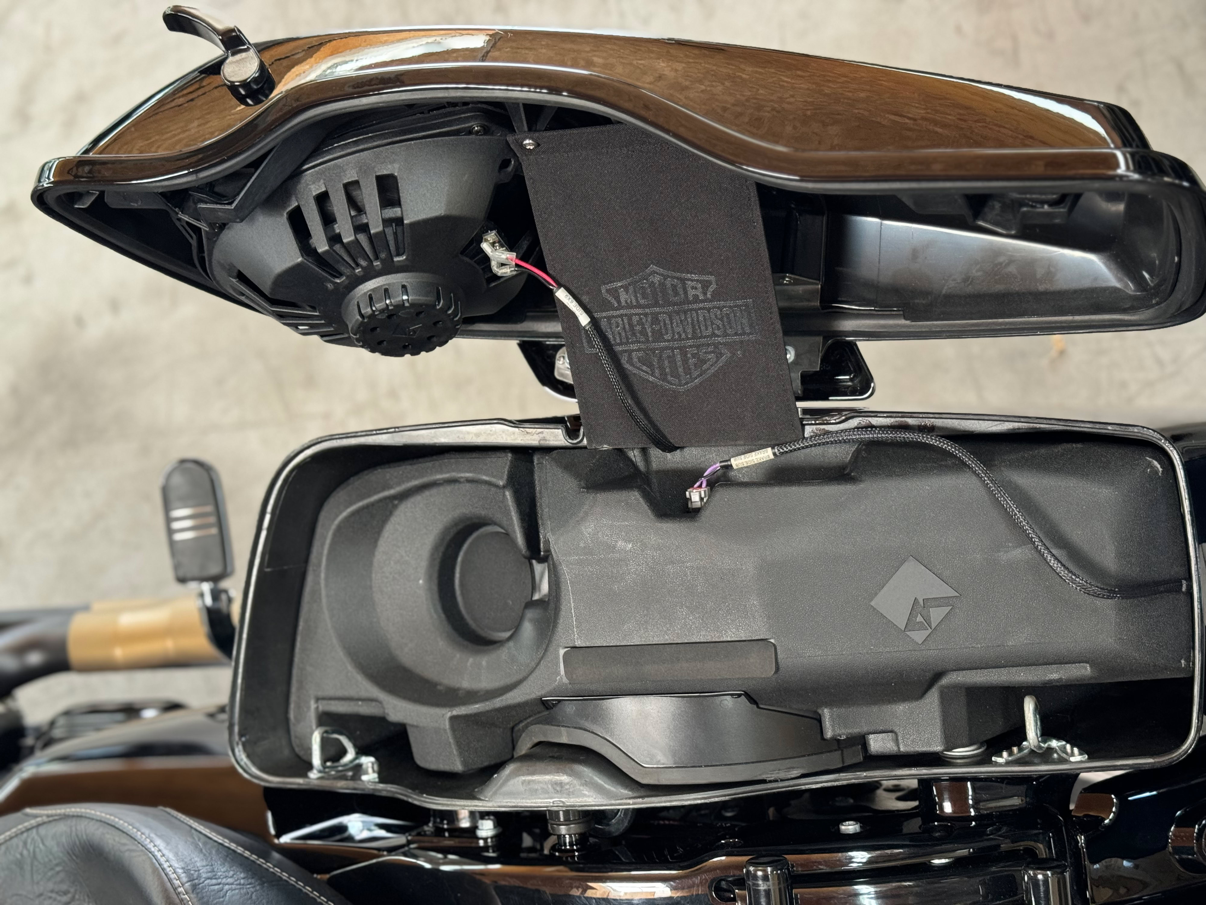 Last but not least, kümmerten wir uns um den Sound der Musikanlage. Serienmäßig glänzt diese nicht unbedingt mit druckvollen Bässen und klaren Höhen und daher entschieden wir uns für den größten Umbau den Rockford Fosgate hier zu bieten hat. Das bedeutet im Detail: Rockford Fosgate HD14-Stage5 und HD14SBSUB, bestehend aus neuen Koax-Lautsprechern für die Fairing, zusätzliche 6x9“ Koax-Lautsprecher in den Seitenkofferdeckeln und zwei Class-D Verstärkern mit insgesamt 1200W RMS-Leistung. Damit die Reisetauglichkeit aber nicht vollends zum Erliegen kommt montierten wir nicht beide beigestellten Subwoofer in jeweils einem Koffer, sondern verbauten nur in einem Koffer einen speziellen 25cm Groundzero Doppelschwingspulen Subwoofer um den Impedanz Anforderungen des Verstärkers gerecht zu werden. Damit kann Christian den zweiten Koffer noch ganz normal nutzen. Nachdem alles verbaut wurde und gefühlt kilometerweise Kabel verlegt waren ging es an die Einstellung der Frequenzweichen und die Parametereinstellungen des Radios, danach zum Soundcheck.