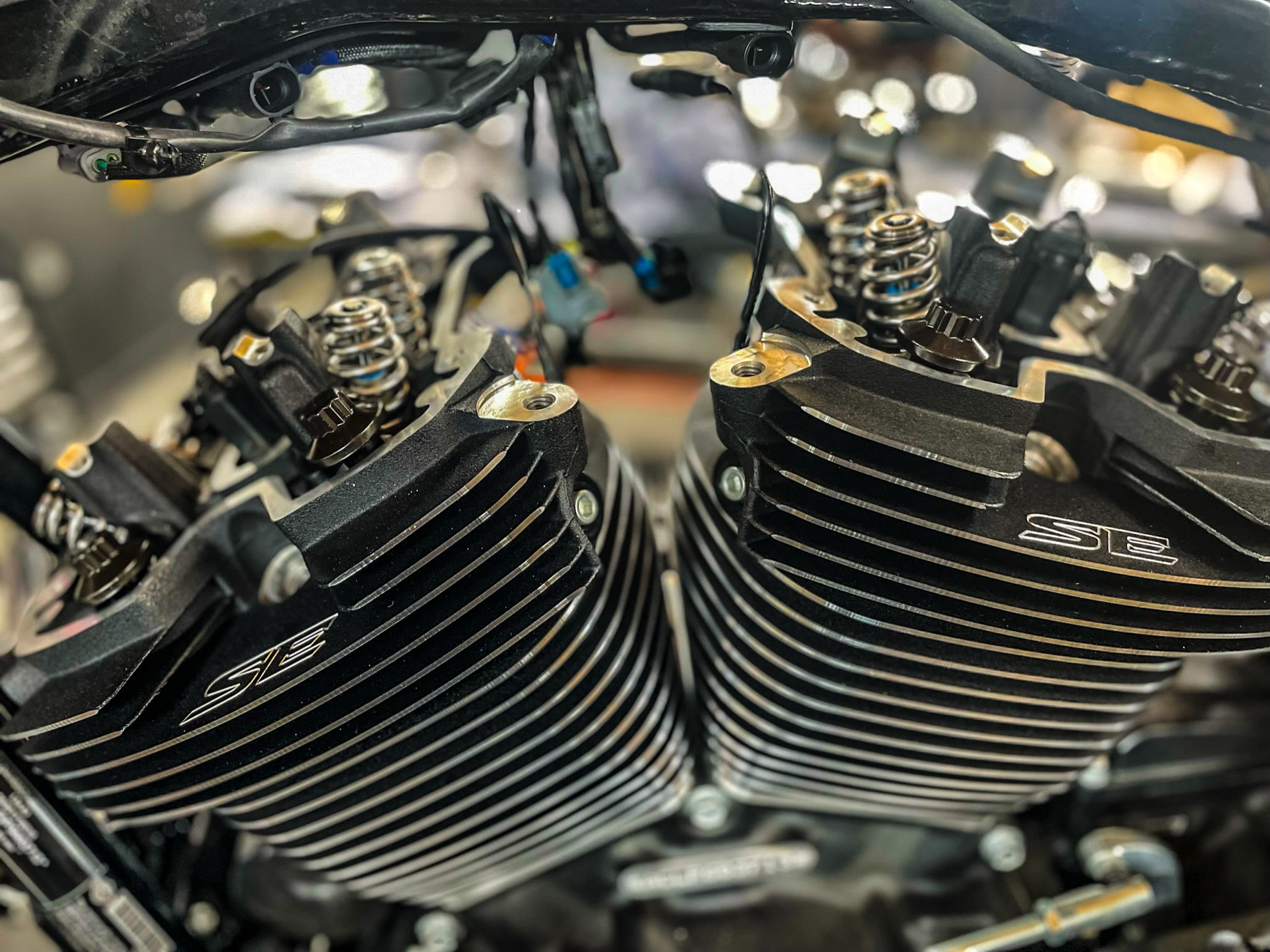 Wir haben uns aber zu Gunsten einer höheren Leistungsausbeute entschieden die Screamin´Eagle Nockenwelle nicht zu verbauen und verwendeten anstatt eine Star Racing ¾ Race Cam. Die Ventilfedern des Kit´s, eine bekannte Schwachstelle, haben wir auch gegen Pendants von Star Racing mit Federtellern aus Titan getauscht. Zusätzlich wurde eine Screamin´Eagle High Volume Ölpumpe verbaut. Der serienmäßige 117cui Heavy Breather Luftfilter wurde bearbeitet und um die gesteigerte Einatmung der 64mm Drosselklappe nicht zu behindern und damit der verbrannte Kraftstoff ebenso rasant wieder ausgeatmet werden kann, bedienten wir uns aus dem Regal von Vance&Hines. Genauer gesagt um deren X-Pipe Krümmer. Die Schalldämpfer sind, wie gewohnt elektrisch verstellbar und von „The Jekill und Hyde Company“. Zum Abschluss noch ein blitzsauberes Mapping von DON-Performance und das Ergebnis mit 135PS und 200NM kann sich durchaus sehen lassen.