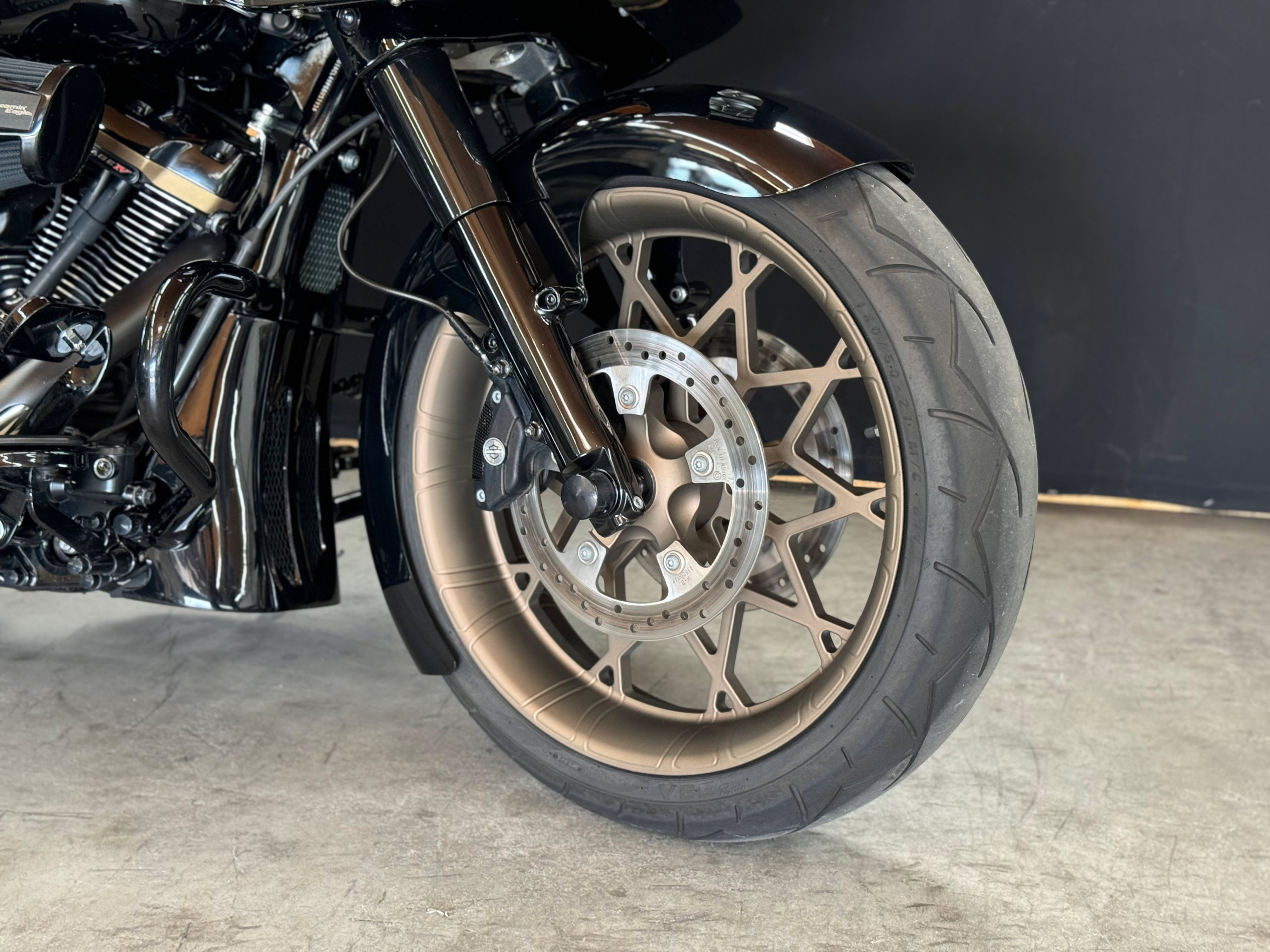 Soweit zur Pflicht, weiter ging es mit der Kür, begonnen mit einem Fat Tire Kit, d. h. mit gefräster 5x21 Zoll Felge und 180/50/21 Bereifung. Zusätzlich mussten spezielle Gabelbrücken verbaut werden, um die Freigängigkeit des FatTires zu gewährleisten. Natürlich alles mit dem Segen des TÜV´s und in den Fahrzeugpapieren eingetragen.